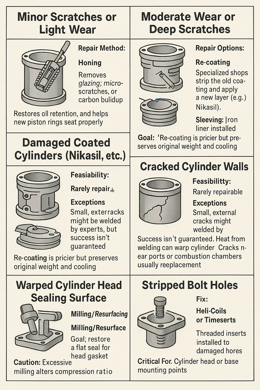 絶対に、 オートバイのシリンダー 損傷の種類と程度に応じて、多くの場合は修復できます。実際的な内訳は次のとおりです。