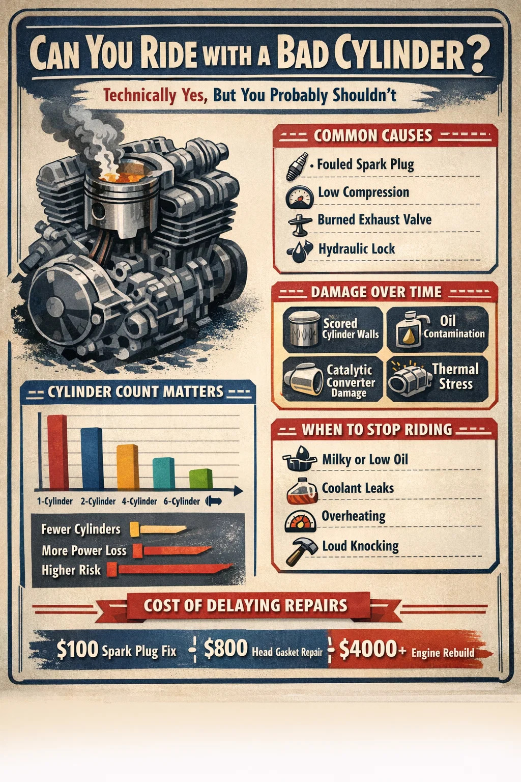 For very short distances at low speed to reach a repair shop, possibly — depending on how many cylinders your engine has and why the cylinder is dead. A four-cylinder bike may manage a few miles at reduced throttle. A parallel twin is far more compromised and should not be ridden beyond an immediate, slow stop. Never ride normally with a dead cylinder expecting no consequences.