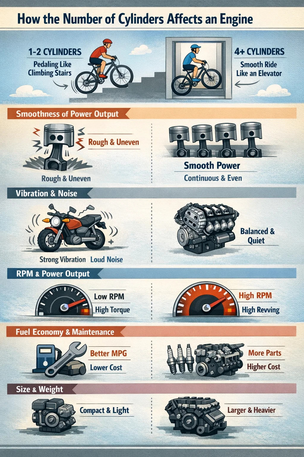 シリンダー数はエンジンの「性格」を直接決定します。シリンダーは自転車をこぐ足のようなものだと想像できます。足の数が多いほど、ペダリング動作がより連続的になり、乗り心地がよりスムーズかつ速くなります。