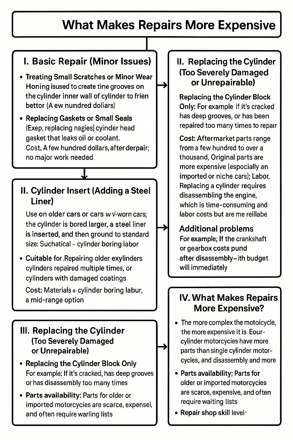 修理にかかる費用は、 オートバイシリンダー は主に問題の重大度、必要な修理の種類、オートバイの構造によって異なります。以下は一般的な状況の説明です。