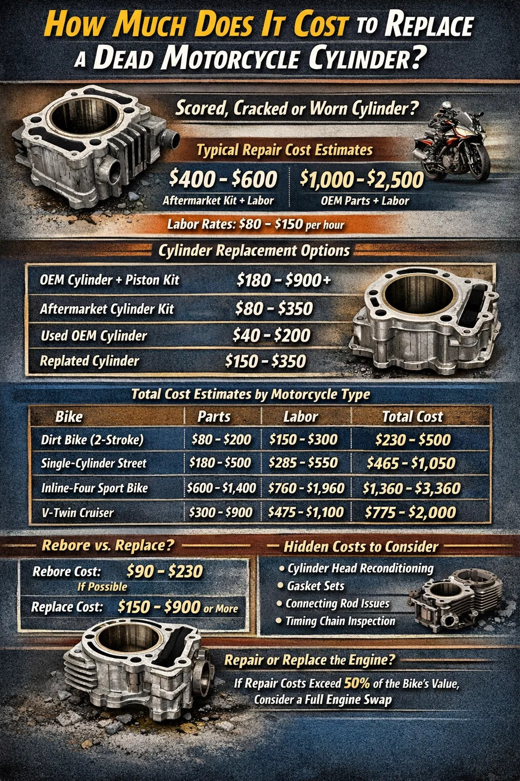 オートバイのシリンダーが焼き付いたり、ひび割れたり、仕様を超えて摩耗したりした場合、通常は次のような修理費がかかります。 300ドルから1,500ドル以上 、エンジンの種類、交換用シリンダーまたはシリンダーキットの費用、およびショップでの工賃に応じて異なります。小型の単気筒コミューター バイクの場合、予算に優しいアフターマーケット シリンダー キットのコストは、部品代だけで 80 ~ 150 ドル程度です。高排気量のツインまたは 4 気筒スポーツ バイクの場合、OEM シリンダー コンポーネントは整備士がレンチを手に取る前に 600 ドルから 900 ドルを超えてしまうこともあります。通常 1 時間あたり 80 ~ 150 ドルかかる人件費と、4 ~ 8 時間かかる作業が追加されると、総コストは急速に上昇します。