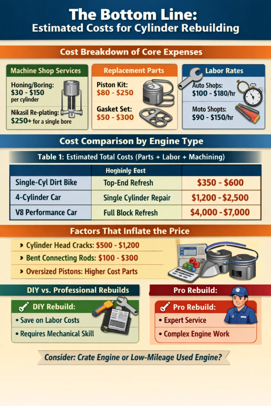 シリンダーの再構築は単一の作業ではなく、部品、専門の機械加工サービス、集中的な労働の組み合わせです。お金がどこに使われるかを理解するには、エンジン ブロックとピストン アセンブリの特定の要件を確認する必要があります。