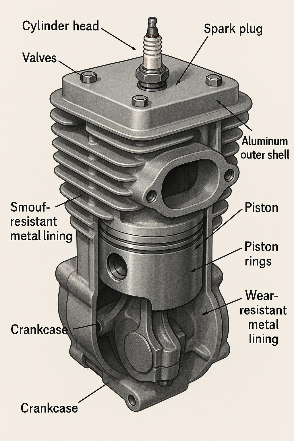 一般にアルミニウムの外側シェル (軽量で熱放散が早い) があり、内側にはピストンの摩耗を防ぐために耐摩耗性の金属ライニング (ニッケル - シリコン コーティングや鉄ライナーなど) が付いています。