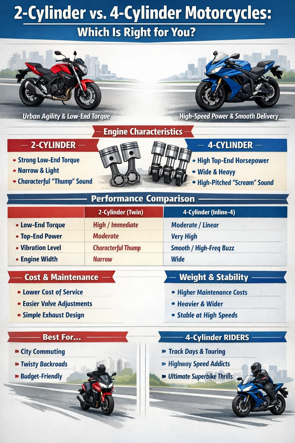 2 気筒バイクと 4 気筒バイクのどちらが「優れている」かという質問には普遍的な答えはありませんが、機能的な違いは明らかです。 2 気筒オートバイは低速トルク、都市部での機敏性、狭い人間工学に優れていますが、4 気筒オートバイは高速安定性、トップエンドの馬力、スムーズなパワー供給においては誰もが認める王様です。 ライディングが都市部の通勤や山岳地帯のきついツイスティで構成されている場合、多くの場合、2 シリンダーの方がより魅力的な体験を提供します。ただし、高回転エンジンの叫びを求め、サーキットや長い高速道路で時間を過ごすのであれば、4 気筒には追加の重量とコストを支払う価値があります。