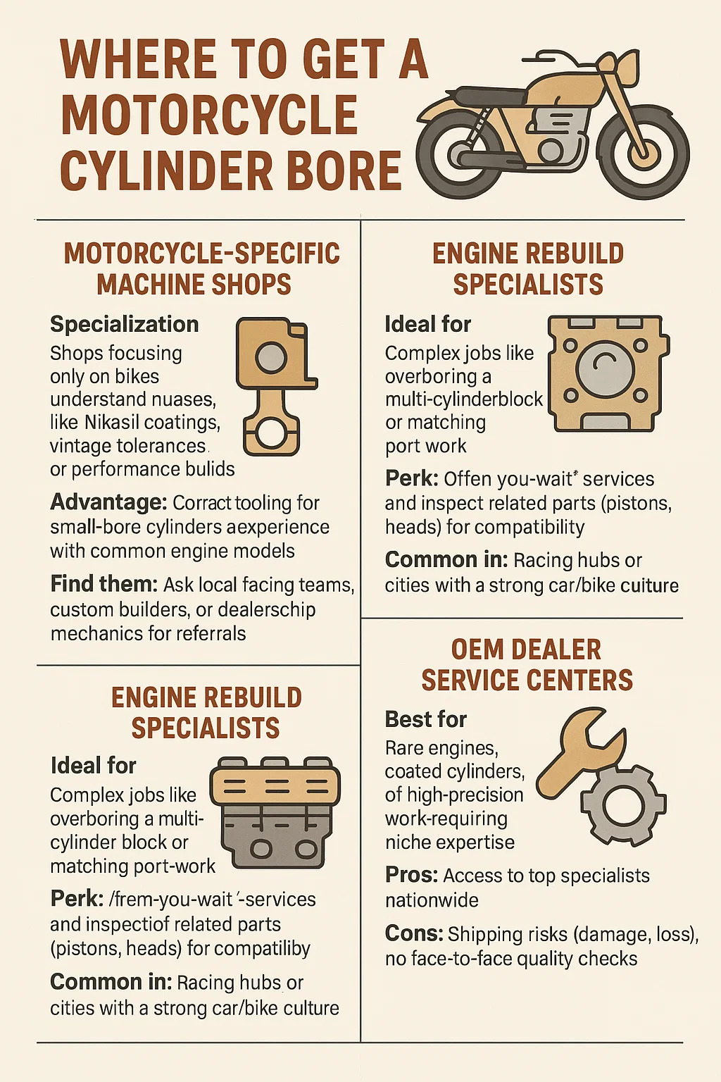 専門分野: バイクのみに焦点を当てているショップは、Nikasil コーティング、ヴィンテージの公差、またはパフォーマンス構築などのニュアンスを理解しています。